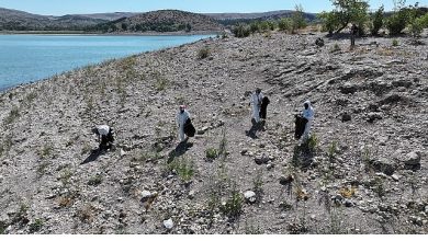 Konya Büyükşehir Belediyesi KOSKİ Genel Müdürlüğü, kuraklıkla birlikte çekilme Altınapa Baraj Gölü’nün etrafındaki çöpleri temizledi.