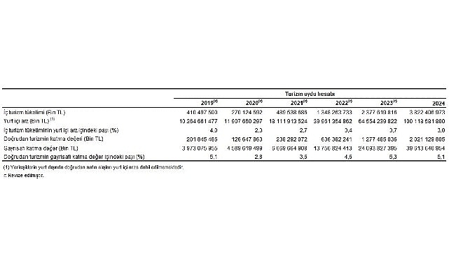 Ülkemizde doğrudan turizm amaçlı gayrisafi katma değer 2024 yılında 2 trilyon 21 milyar 129 milyon 805 bin TL olarak gerçekleşti. Doğrudan turizm amaçlı gayrisafi katma değerin toplam gayrisafi katma değer içerisindeki payı %5,1 oldu.